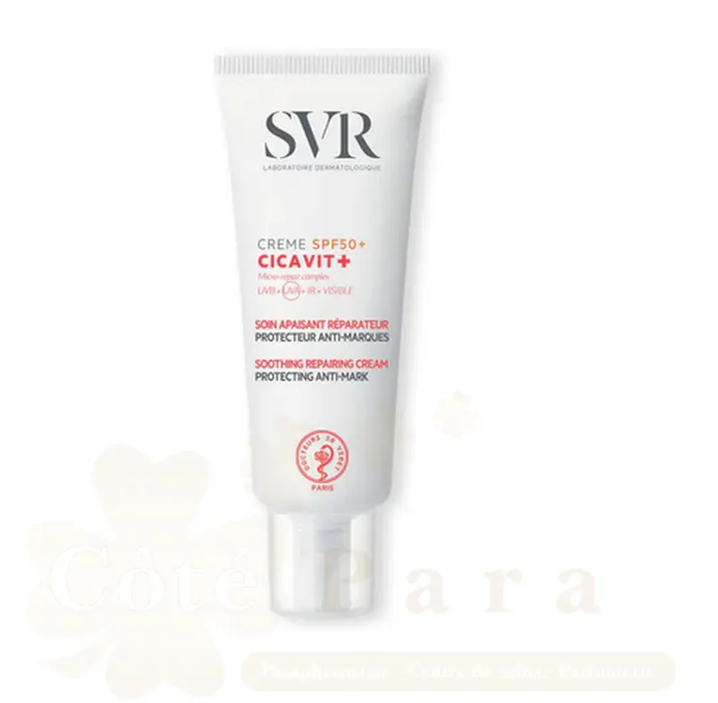Cicavit+ Crème SPF50+ garantit un été sans marques ! Sa texture invisible fusionne avec la peau pour apaiser intensément et accélérer la réparation cutanée X7(1) des peaux abimées et irritées de toute la famille. Formulée avec une technologie filtrante anti-UVA/UVB et un complexe anti-oxydant anti-lumière visible et infrarouges, la crème cible tous les types de rayons(2) pour limiter les risques de marques rouges et brunes. Disponible dans votre parapharmacie en ligne www.cotepara.ma